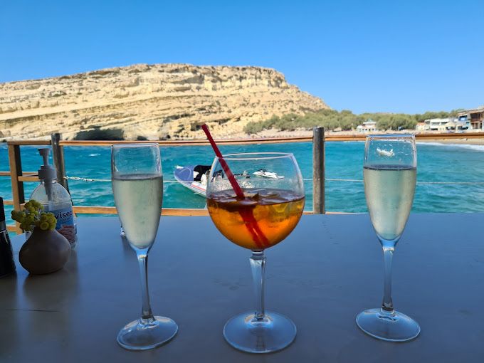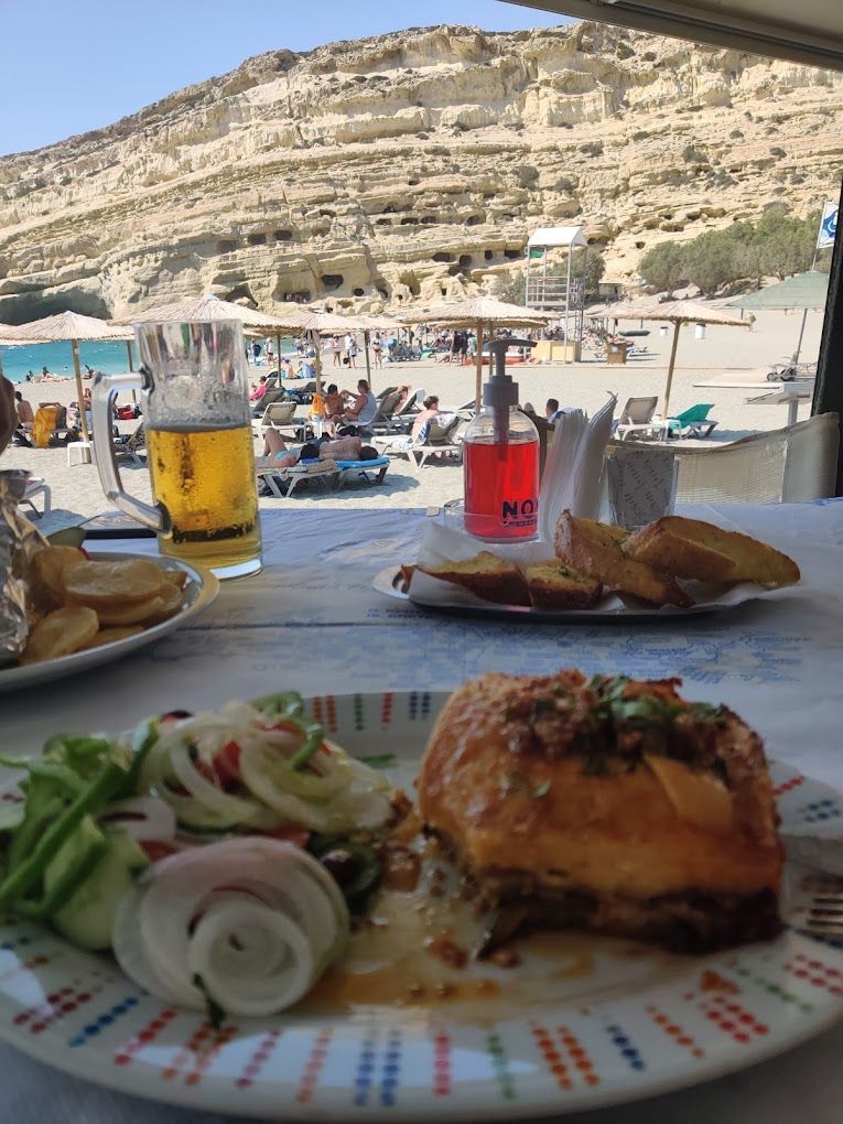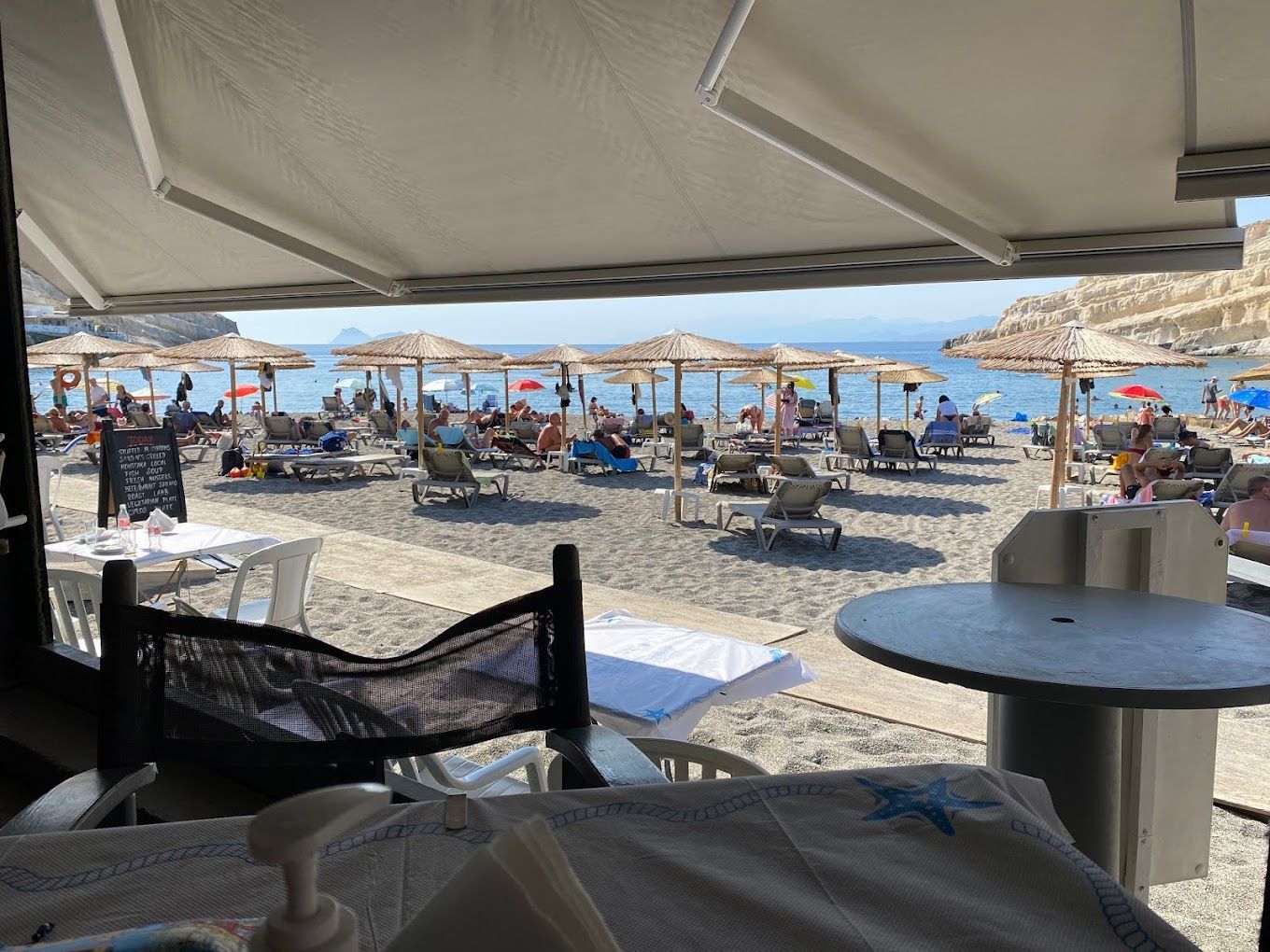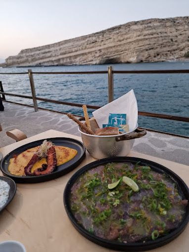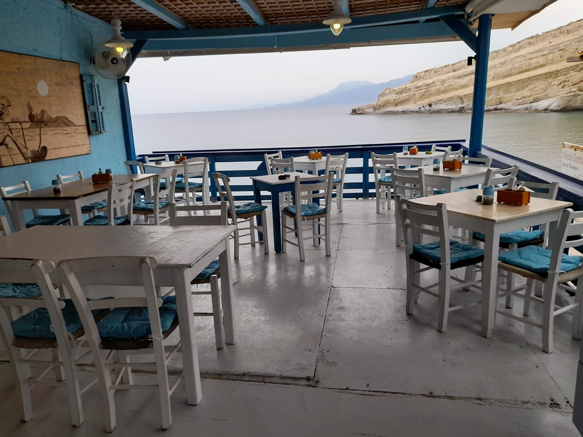 Het zou zonde zijn The Lions op het strand zelf van Matala niet te bezoeken. Dit authentiek restaurant met een exclusief zich op de baai wordt al jaren gerund door Dimitri en zijn team en geniet internationale faam. Boven het restaurant bevindt zich het dakterras waar je kan genieten van heerlijke coctails. Ook daar heb je een uitzonderlijk zicht, en vriendelijke bediening en kan je genieten van de lokale specialiteiten bereid in de keuken door Mike . Een aanrader !